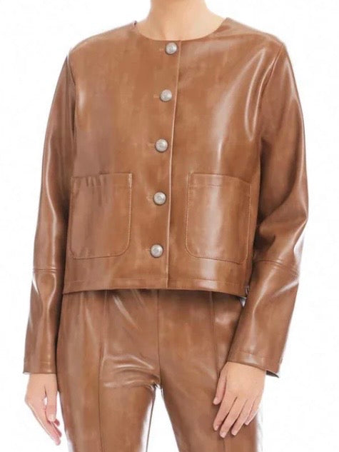 The Kaylyn Faux Leather Jacket brings a polished, modern edge to any look. Designed with a clean scoop neckline and long sleeves, it features metal button closures that add a refined, understated shine. Crafted in faux leather and fully lined for added comfort.
