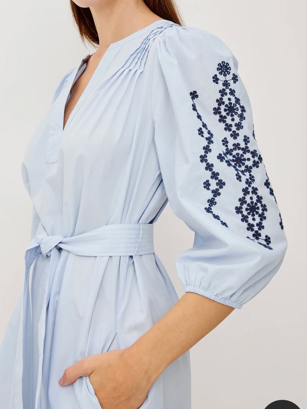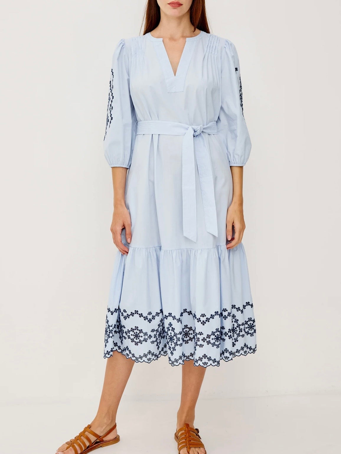 The Carmel embodies effortless elegance in crisp, lightweight poplin, cut in a peasant-style maxi silhouette with pleated shoulders, a V-neckline, three-quarter puff sleeves, adjustable waist ties, a tiered seam, and contrast embroidery at the sleeves and hem.