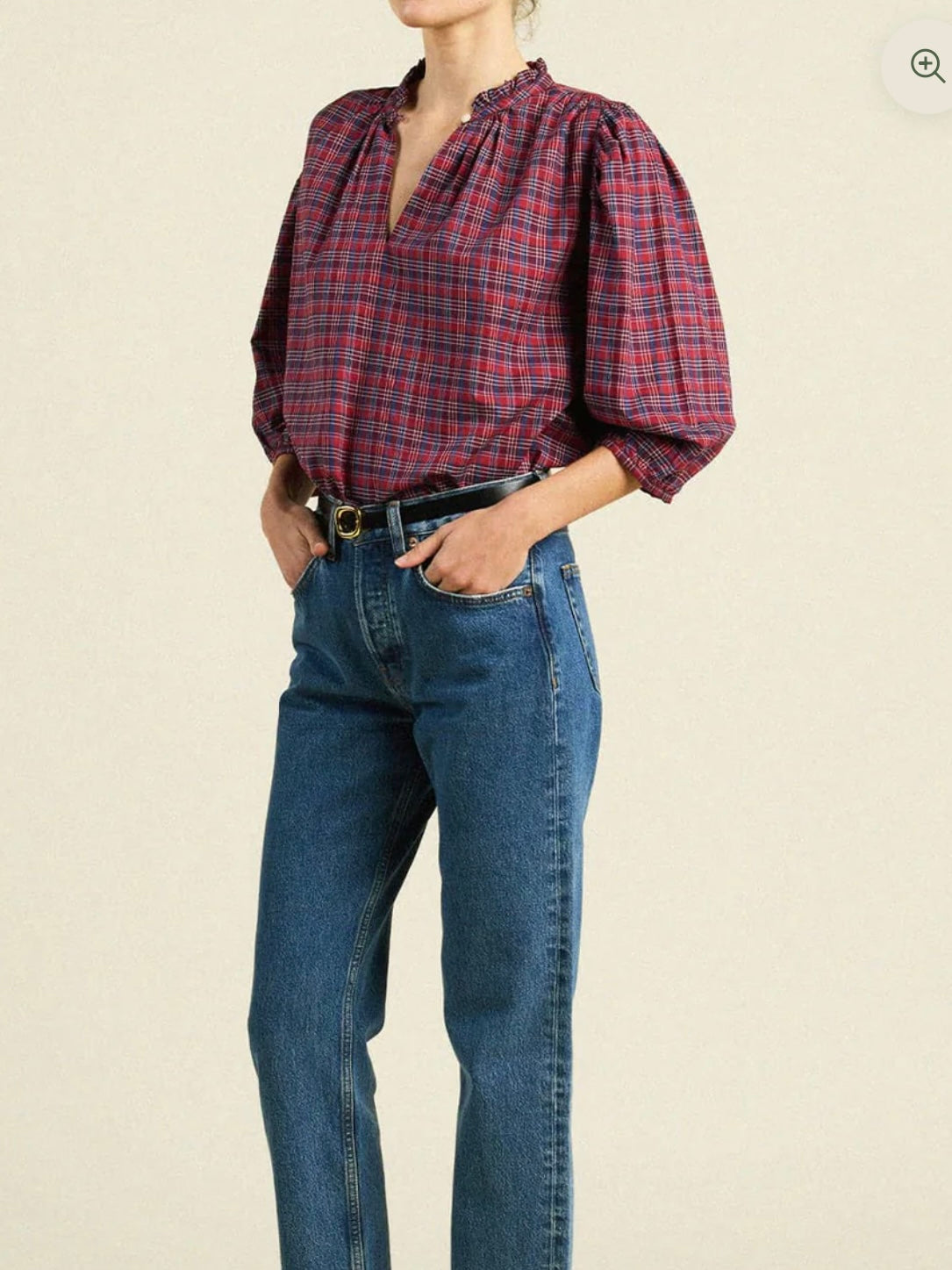 The Orly Blouse is a slightly cropped, billowy blouse with straight bottom hem, split v-neckline and buttoned crown collar. Gathered three-quarter length sleeves finished with delicate bindings. Includes our signature back detail with a gathered waist tab. Shown here in Mulled Wine Plaid and made from our cotton.