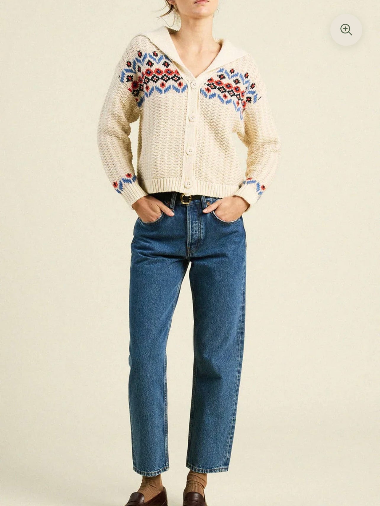 Our Savannah cardigan has a textured basket weave in antique white with complementary cream sailor collar and cuffs. Finished with our gold owl buttons. Shown here in Antique White Fairisle and made from our merino wool.