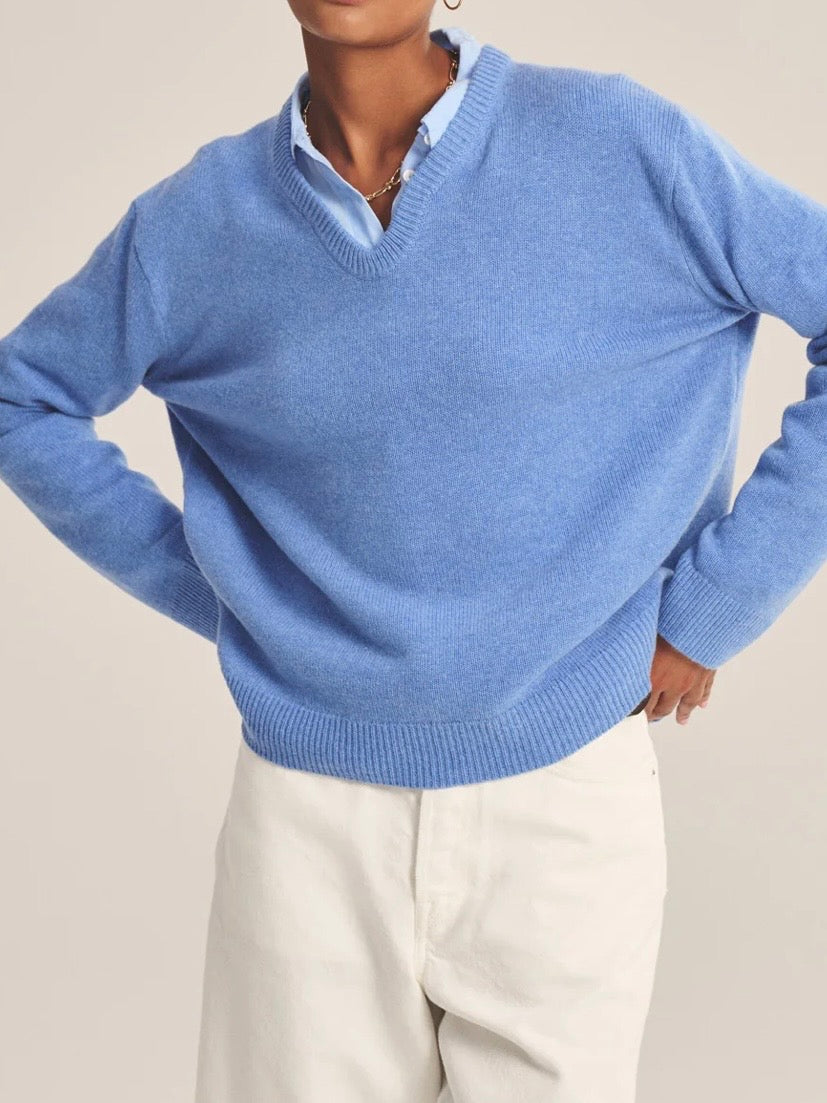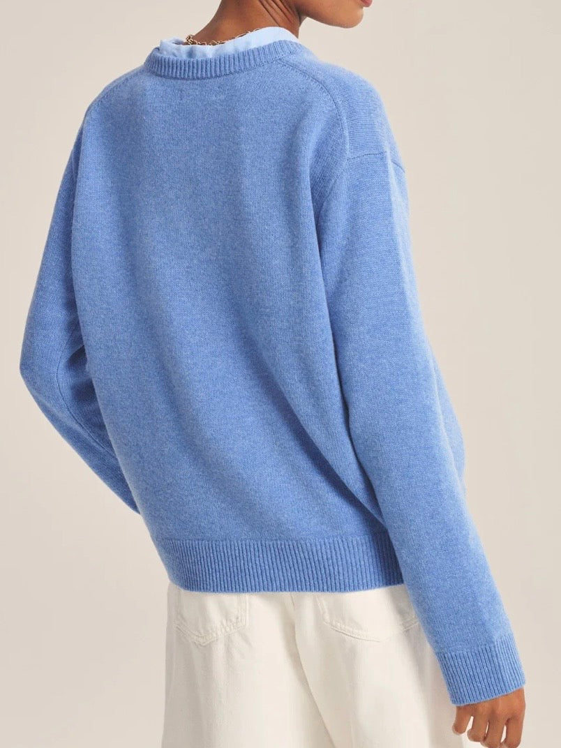 Crafted from a cozy cashmere-wool blend, this sweater features ribbed trims and a distinctive U-shaped neckline for a modern, relaxed silhouette. Perfect for layering a tee underneath, it's a staple that adds an effortless, on-trend touch to any outfit.