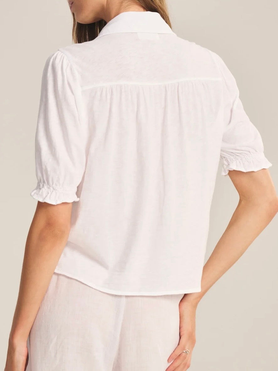Crafted from soft cotton slub, this tee elevates a classic silhouette with refined style. It features a full button front and classic collar for timeless structure, with pleated detailing down the front adding subtle texture. The back is softly ruched, and slightly puffed sleeves with ruffle elastic cuffs bring a feminine, elevated touch.